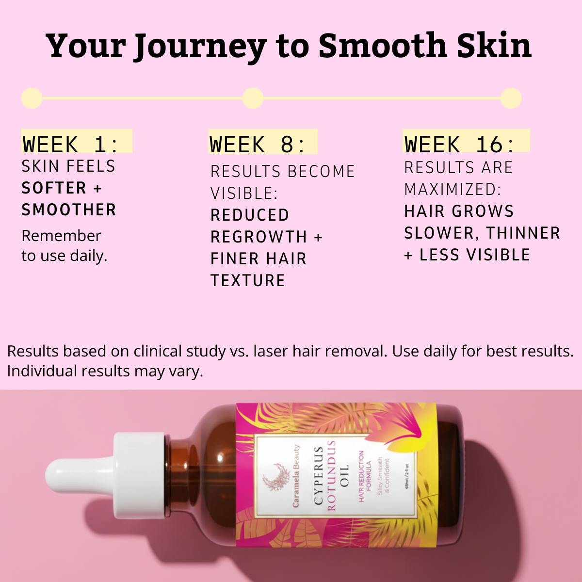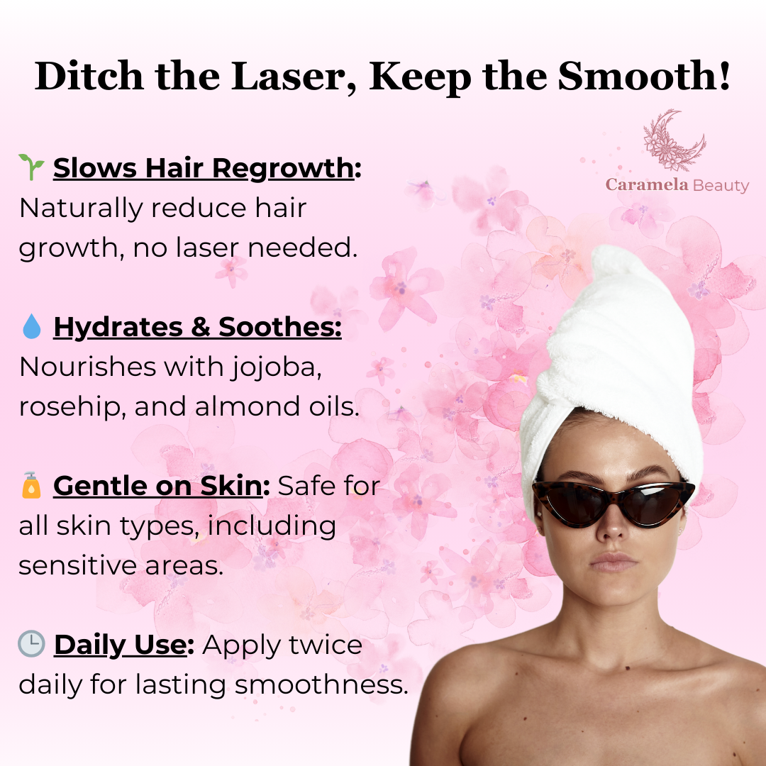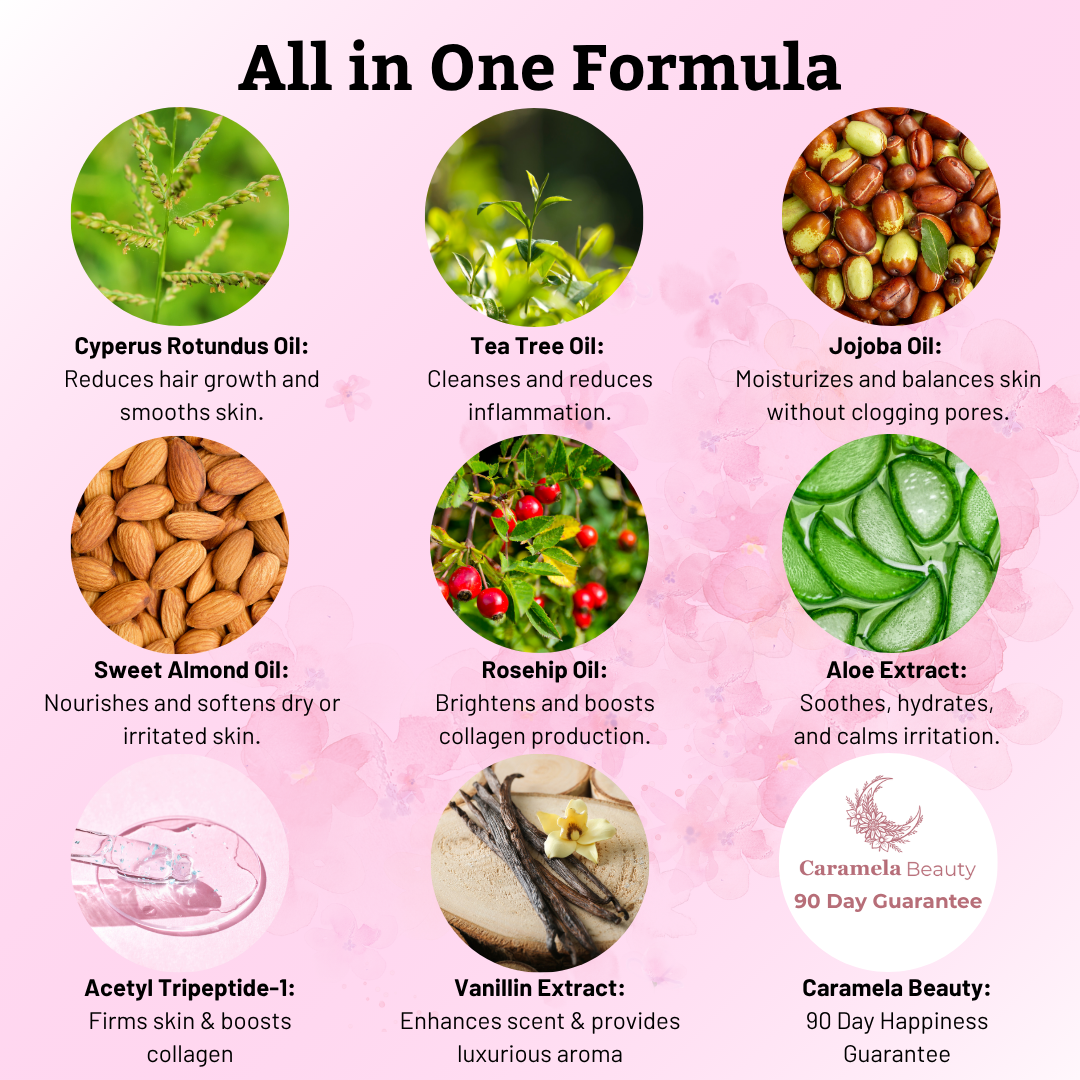 Say goodbye to unwanted hair with Caramela Beauty's Cyperus Rotundus Oil. Packed with natural ingredients to reduce hair growth over time for gentle, pain-free results. Achieve smoother, silkier skin naturally and effortlessly. ✨